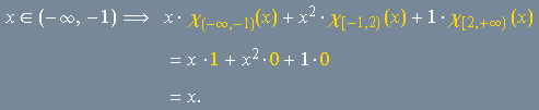 Esta função é definida por três fórmulas distintas. Utilizando as funções características dos três intervalos, podemos encontrar uma expressão única para essa função. De fato,